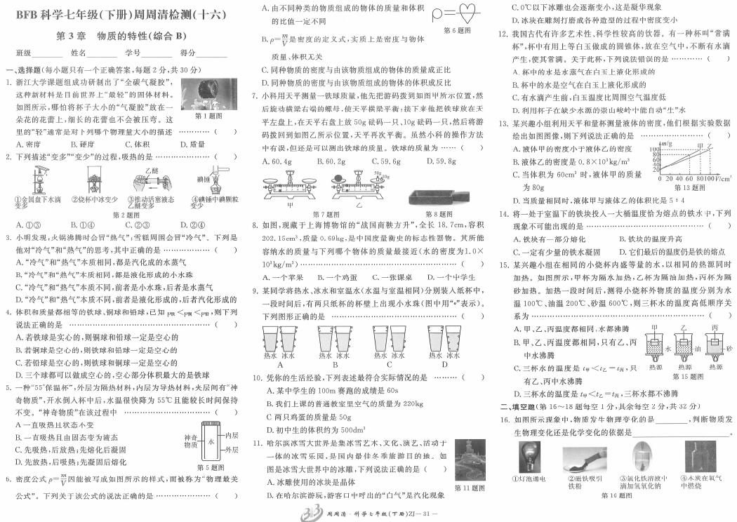 【新教材】七下周周清试卷第3章 物质的特性(综合B)(扫描附答案)