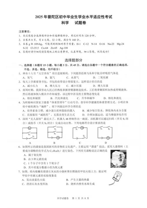 2025年5月舟山市普陀区中考科学二模卷试题(扫描附答案)