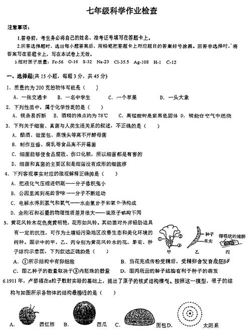 2024学年第二学期金华四中七下科学5月月考试题(扫描无答案)