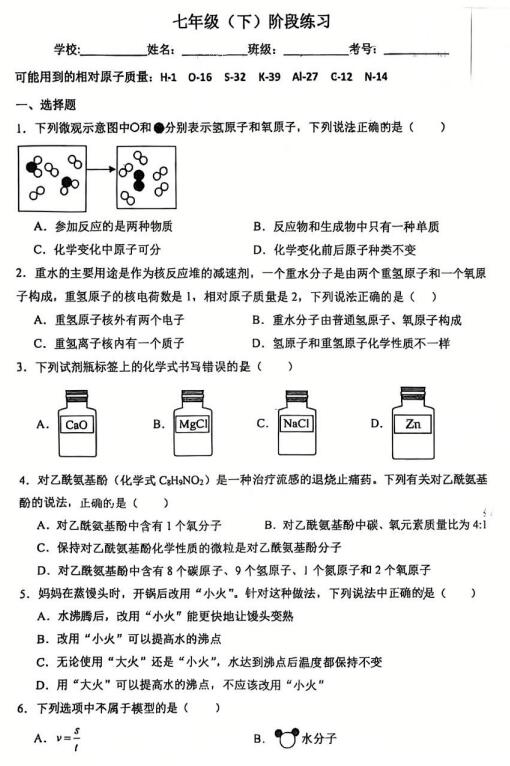浙江省嘉兴市清华属中嘉兴实验学校2024学年第二学期七年级(下)阶段练习试卷(扫描PDF版,无答案 1-3章)