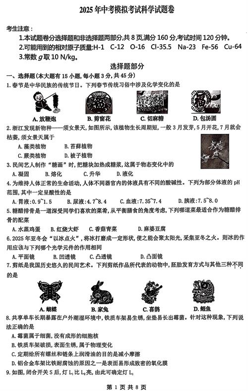 2025年5月杭州临平区中考二模科学卷(扫描附答案)