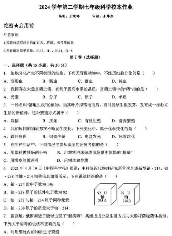 浙江省金华市义乌市四校(稠城中学,北苑中学,稠江中学,望道中学)2024-2025学年七年级下学期5月月考科学试题(扫描PDF版,含答案)