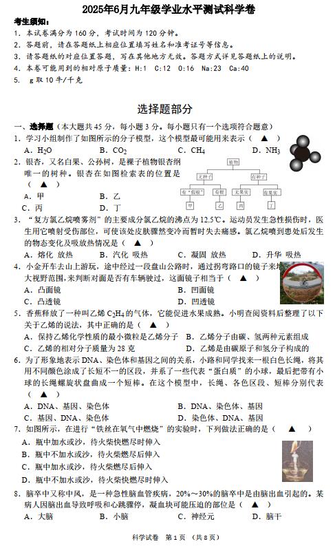 A. 瓶中加水或沙,待火柴快燃尽时伸入 B. 瓶中不加水或沙,待火柴燃尽后伸入 C. 瓶中加水或沙,待火柴燃尽后伸入 D. 瓶中不加水或沙,待火柴快燃尽时伸入 8.脑卒中又称中风,是一种急性脑血管疾病, 20%~30%的脑卒中是由脑出血引起的。某 病人因脑出血导致呼吸和心跳骤停,凝血块可能压迫的部位是( ▲ ) A.大脑 B.小脑 C.神经元 D.脑干