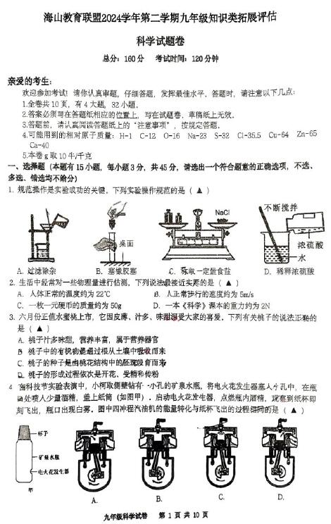 浙江省海山教育联盟2024学年第二学期九年级知识类拓展评估 科学试题卷(扫描PDF版,无答案)