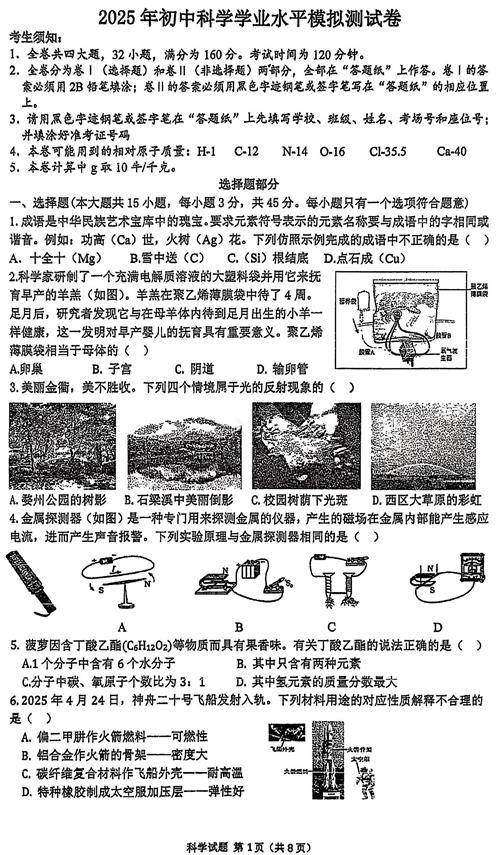 2025年金华市第四中学中考科学三模(扫描无答案)
