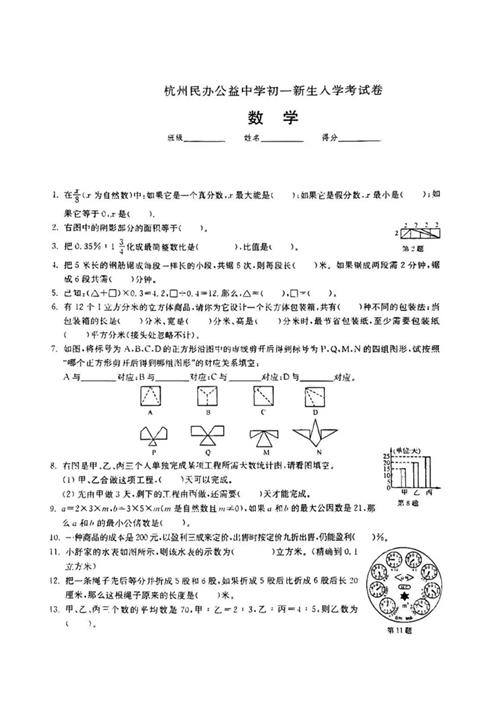 2024年杭州公益中学新生初一分班考数学试卷(扫描无答案)