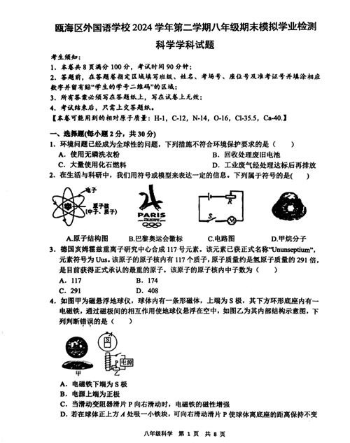 2024学年第二学期瓯海外国语八下期末模考(扫描附答案)