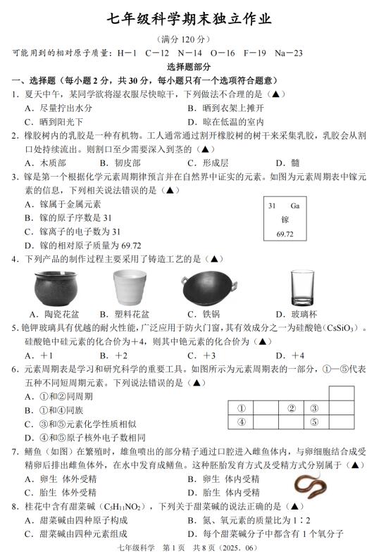 2025年6月浙江省杭州余杭、临平联盟七下期末模拟试题(扫描含答题卡·答案)