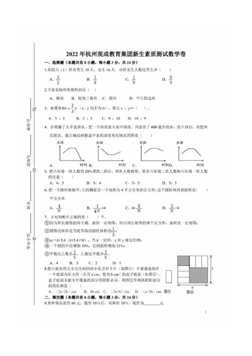 2022年杭州观成新生初一分班考试数学卷(扫描无答案)