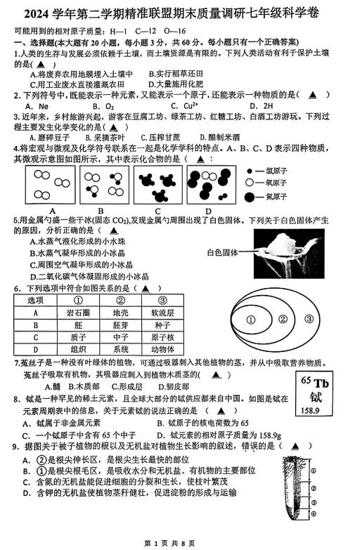 浙江省宁波市北仑区2024学年第二学期精准联盟期末质量调研七年级科学卷(扫描PDF版,无答案)