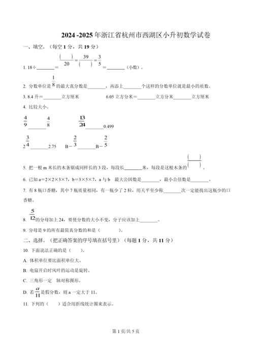 2024-2025年杭州市西湖区小升初数学试卷(扫描无答案)