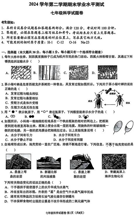 浙江省杭州市临平区2024 学年第二学期期末学业水平测试 七年级科学试题卷(扫描版,无答案)