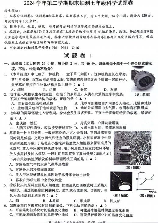 浙江省宁波市宁海县2024学年第二学期期末抽测七年级科学试题卷(扫描版,无答案)
