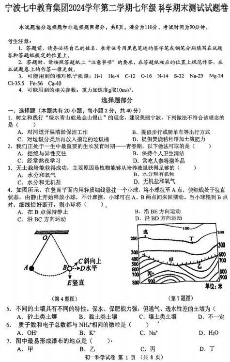 浙江省宁波市宁波七中教育集团2024学年第二学期七年级科学期末测试试题卷(扫描PDF版,无答案)