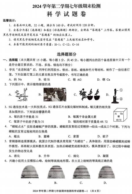 浙江省金华市金东区2024学年第二学期七年级期末检测科学试题卷(扫描pdf版,无答案)