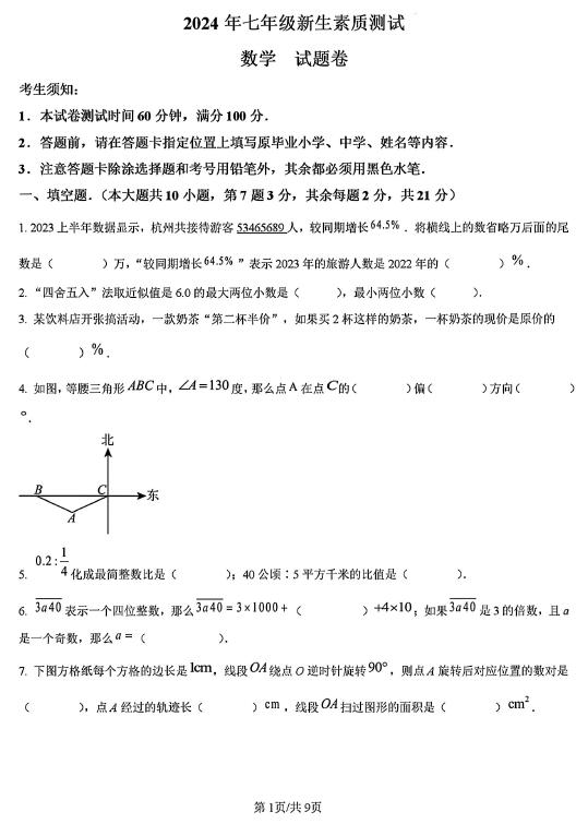浙江省杭州市2024年拱墅区初一新生分班考数学试题(扫描含答案)