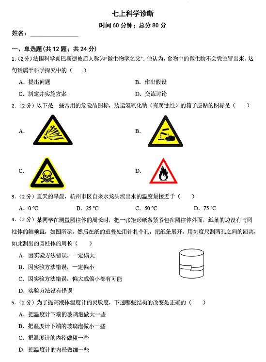 浙江省温州市实验中学2024-2025学年初一新生分班考科学试题(扫描含答案)