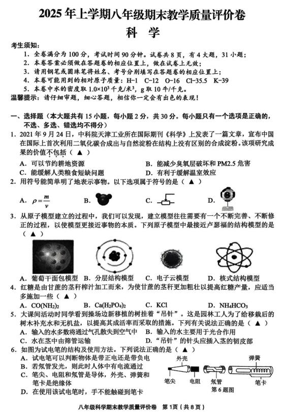 浙江省金华市2025年上学期八年级期末教学质量评价卷 科学(扫描PDF版,含答案)