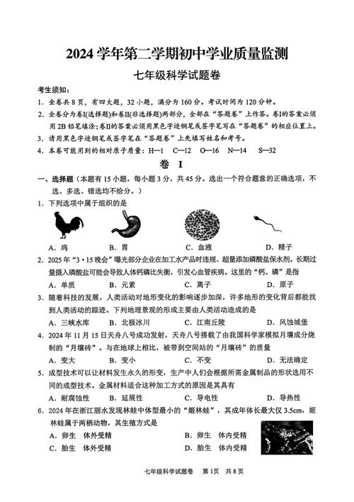 浙江省丽水市莲都区2024学年第二学期初中学业质量监测 七年级科学试题卷(扫描PDF版,附答案)
