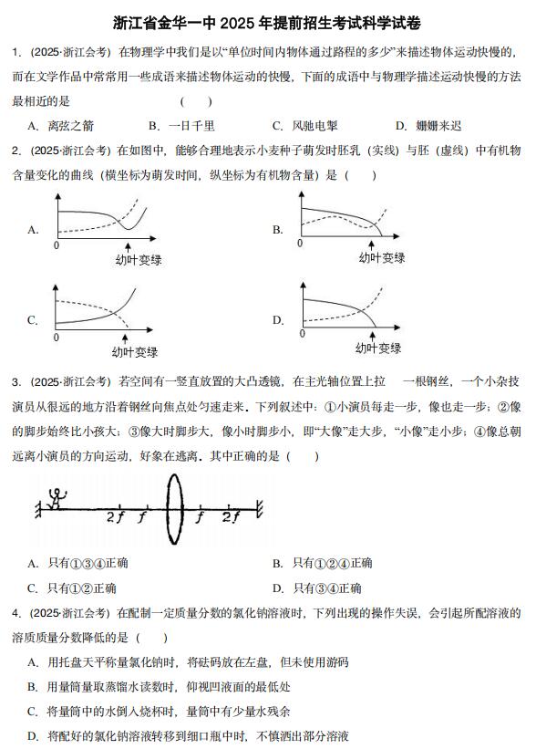 2.(2025·浙江会考)在如图中,能够合理地表示小麦种子萌发时胚乳(实线)与胚(虚线)中有机物