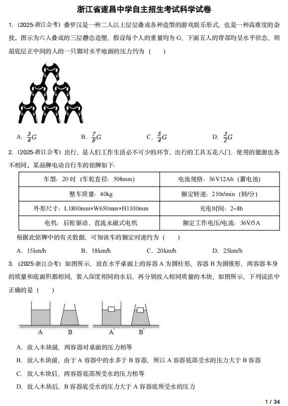 3.(2025·浙江会考)如图所示,放在水平桌面上的容器 A 为圆柱形,容器 B 为圆锥形,两容器本身