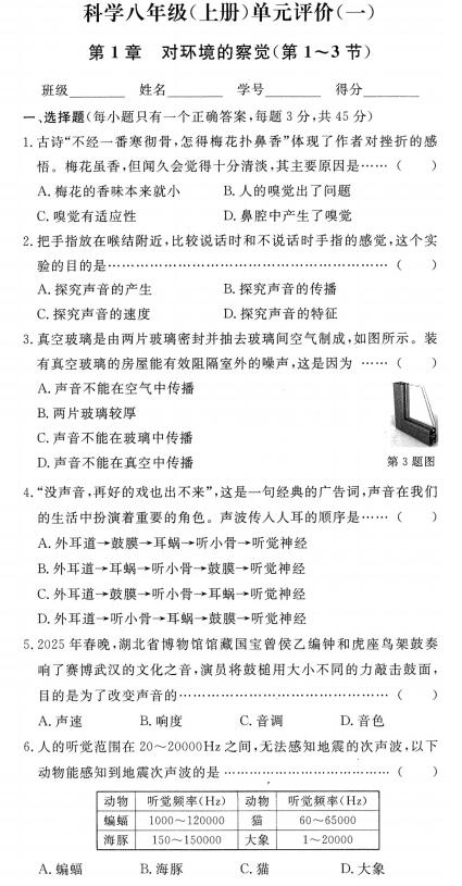 八上周周清第一章 对环境的察觉(1~3节)(扫描附答案)