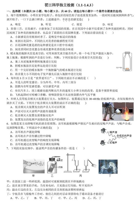 浙江省杭州市公益中学2025学年第一学期八年级 料学独立检测(1.1-1.4.3)(扫描PDF版,含答案)