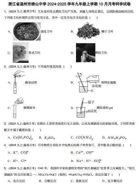 5.(2024 九上·温州月考)1943 年,我国科学家侯德榜发明的“侯氏制碱法”在世界上反响很大。“侯氏