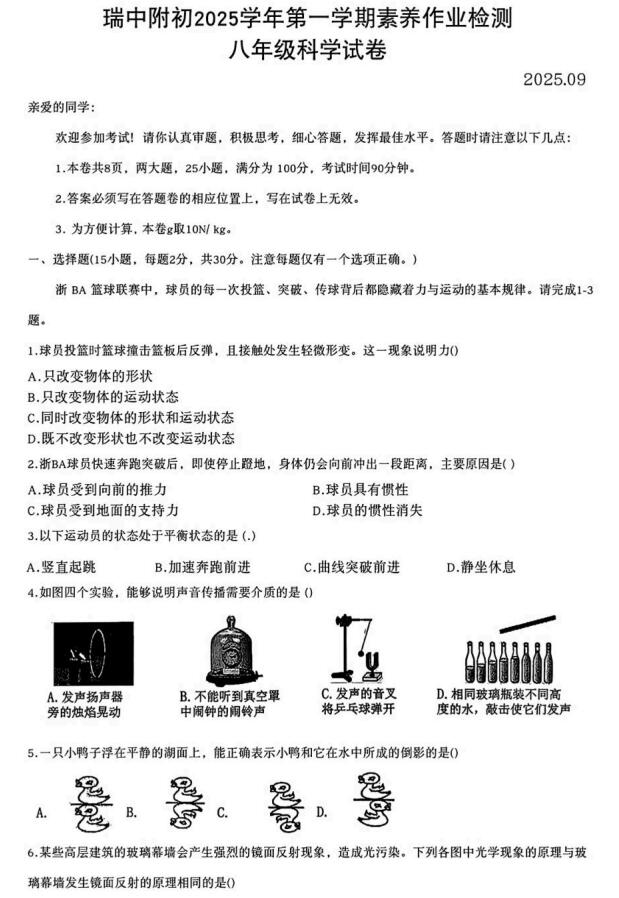 浙江省温州市瑞安市瑞安中学附属初级中学2025学年第一学期素养作业检测 八年级科学试卷(扫描PDF版,无答案 1-2章)