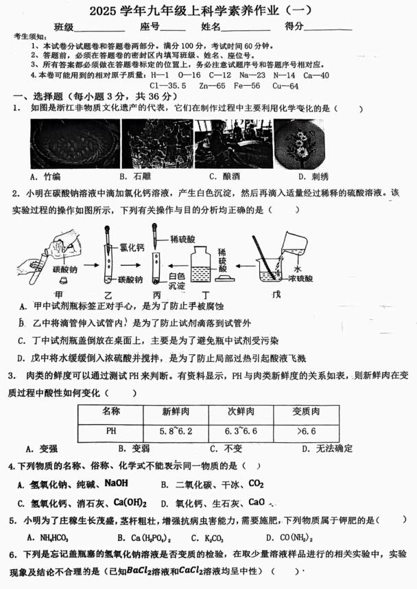 浙江省嘉兴市嘉兴南湖实验学校2025学年九年级上科学素养作业(一)(扫描PDF版,无答案 第1章)