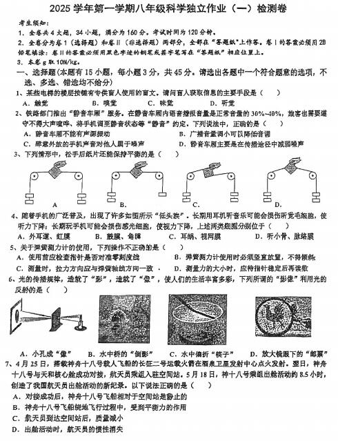 浙江省金华市婺城区2025学年第一学期八年级科学独立作业(一)检测卷(扫描PDF版,无答案 1-2章)