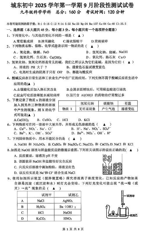 浙江省绍兴市诸暨市城东初中2025学年第一学期9月阶段性测试试卷 九年级科学(扫描PDF版,含答案 第1章)