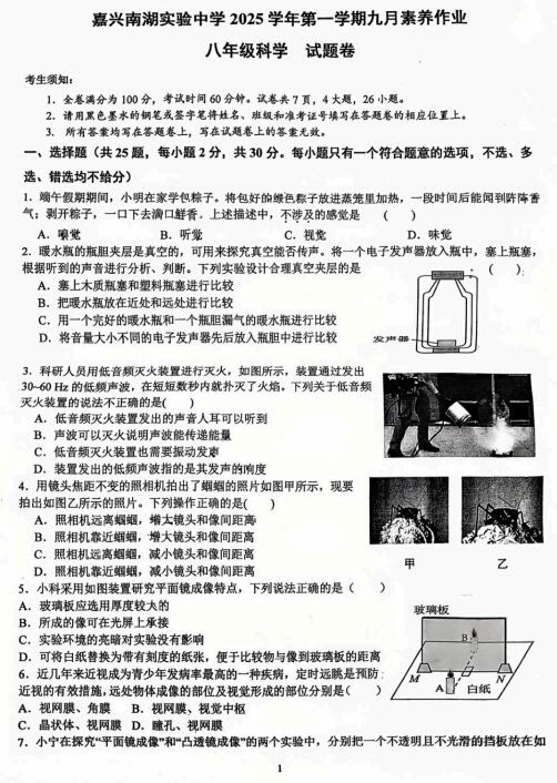 浙江省嘉兴市南湖实验中学2025学年第一学期九月素养作业 八年级科学试题卷(扫描PDF版,无答案 第1章)