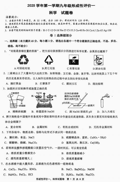浙江省嘉兴外国语学校2025学年第一学期九年级形成性评价一 科学 试题卷(扫描PDF版,无答案 1.1-2.4)