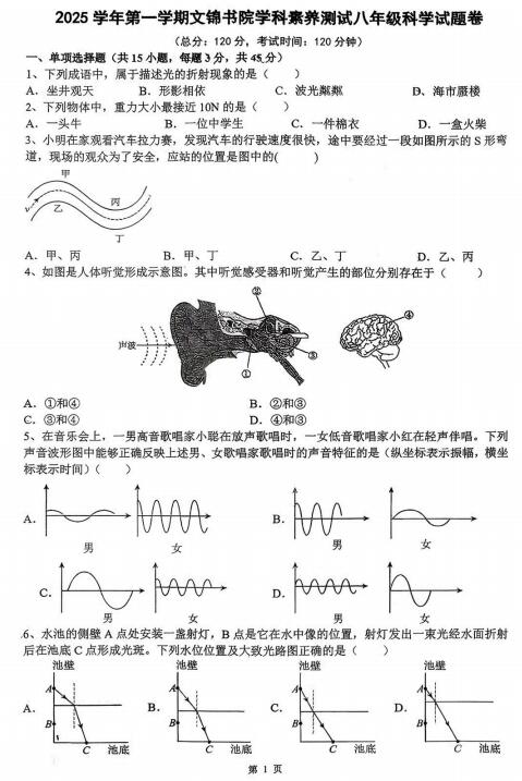 浙江省宁波市慈溪市文锦书院2025学年第一学期文锦书院学科素养测试八年级科学试题卷(扫描PDF版,无答案 1-2章)