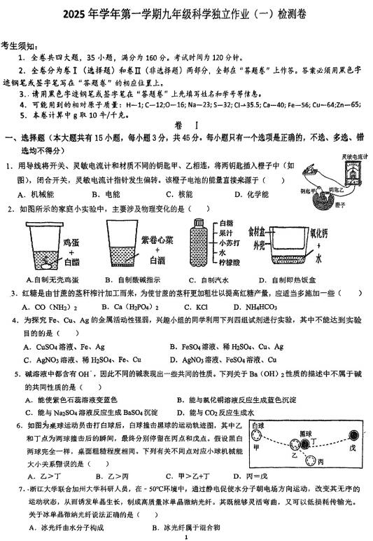 浙江省金华市婺城区2025年学年第一学期九年级科学独立作业(一)检测卷(扫描PDF版,含答案 1.1-3.4)