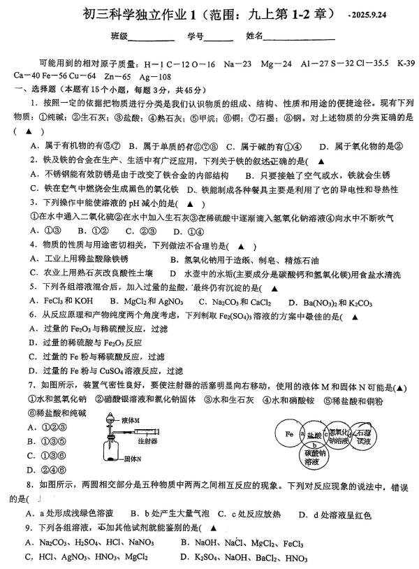 浙江省金华市婺城区初三科学独立作业1(范围:九上第1-2章) -2025.9.24(扫描PDF版,无答案)