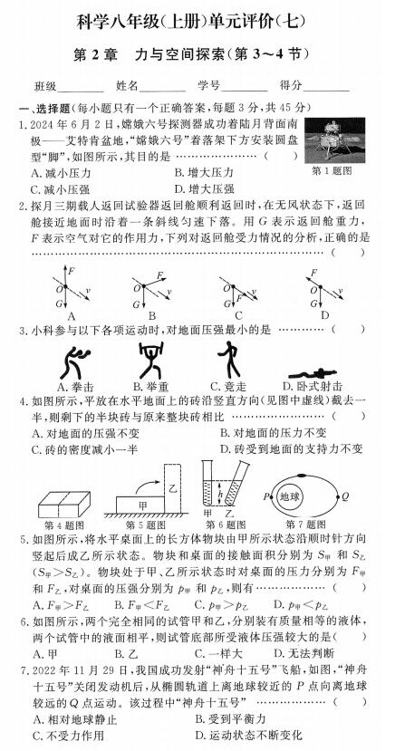 八上周周清试卷第2章 力与空间探索(2.3~2.4)(扫描附答案)