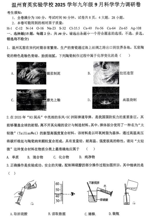 浙江省温州市温州育英实验学校2025学年九年级9月科学学力调研卷(扫描PDF版,无答案 1.1-2.2)