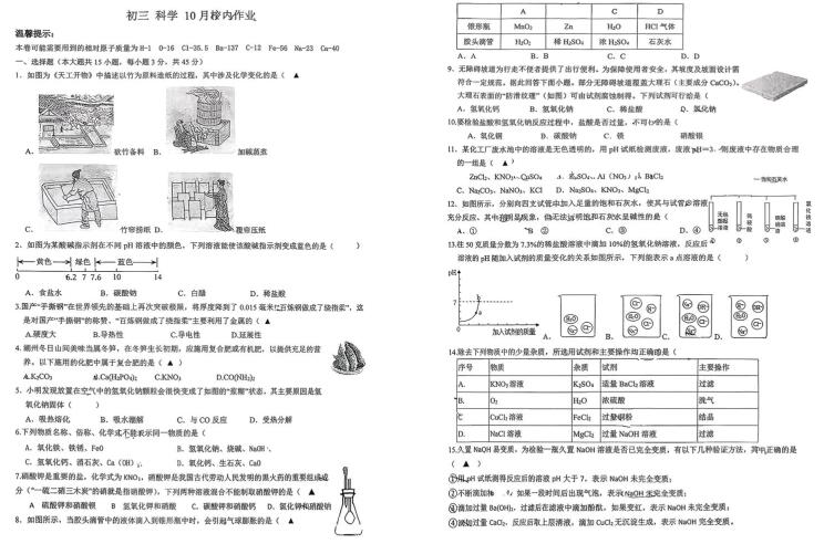 浙江省湖州市第四中学教育集团2025学年初三科学10月校内作业(扫描PDF版,无答案 1.1-2.2)