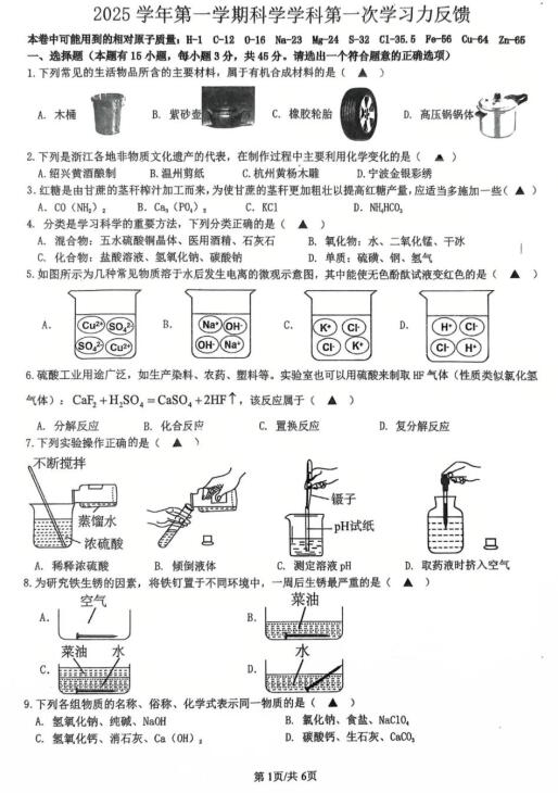 浙江省温州市第十二中学2025学年第一学期科学学科第一次学习力反馈 九年级(扫描PDF版,无答案 1-2章)