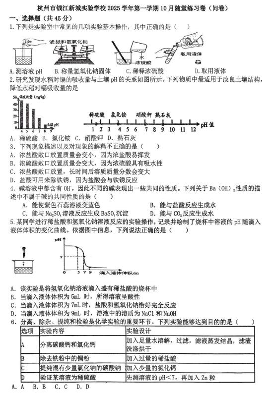 浙江省杭州市钱江新城实验学校2025学年第一学期10月随堂练习卷(问卷)(扫描PDF版,无答案 第1章+3.1-3.4)