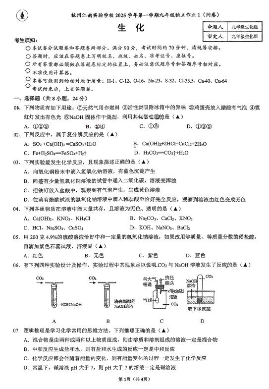 浙江省杭州江南实验学校2025学年第一学期九年级独立作业1(问卷 分科) (扫描PDF版,无答案)