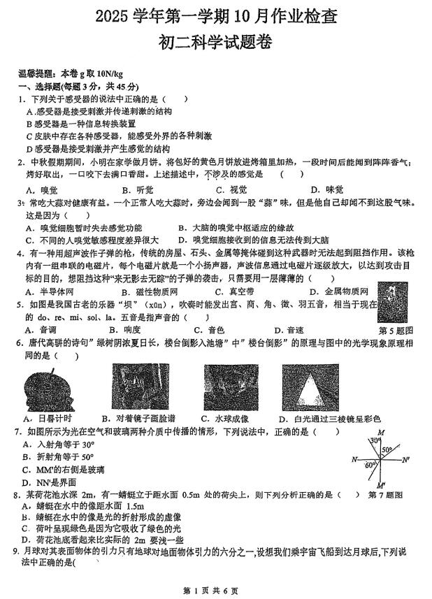 浙江省金华市第五中学2025学年第一学期10月作业检查 初二科学试题卷(扫描PDF版,无答案 1.1-1.4节和第2章)