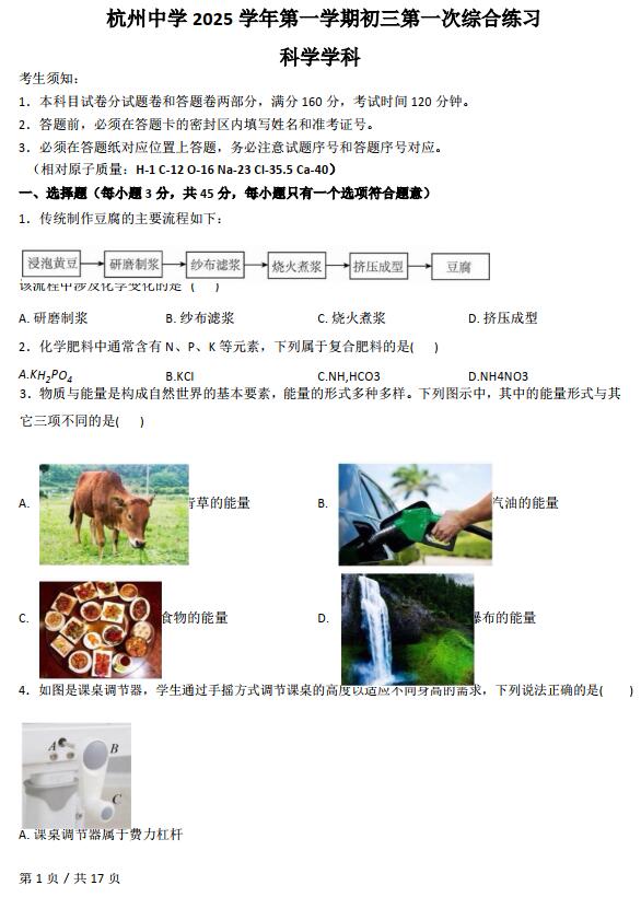 2025学年第一学期浙江省杭州中学10月月考科学试题(扫描含答案;考察范围1.1-3.4)