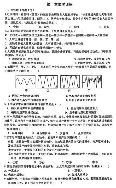 浙江省杭州市白马湖中学2025学年第一学期八年级第一章 对环境的察觉 限时训练(扫描PDF版,无答案)