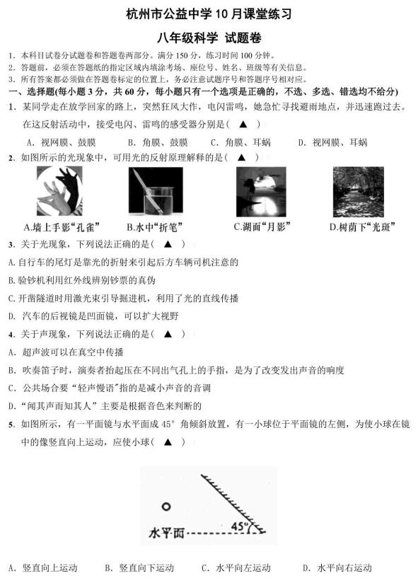 浙江省杭州市西湖区公益中学10月课堂练习 八年级科学试题卷(扫描PDF版,含答案 第1章)