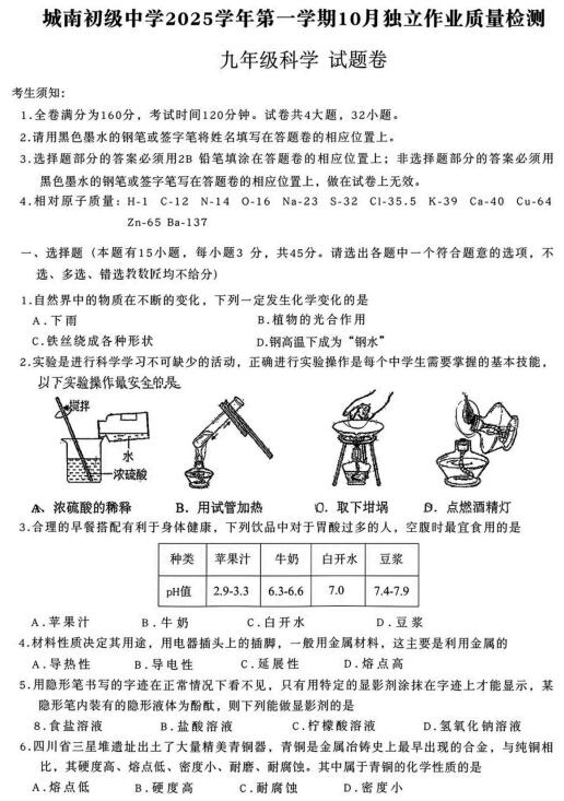 浙江省衢州市柯城区城南初级中学2025学年第一学期10月独立作业质量检测 九年级科学试题卷(扫描PDF版,无答案 1.1-2.4)