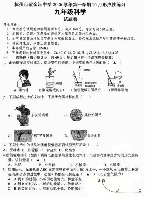 浙江省杭州市紫金港中学2025学年第一学期10月形成性练习 九年级科学试题卷(扫描PDF版,无答案 1.1-3.4)