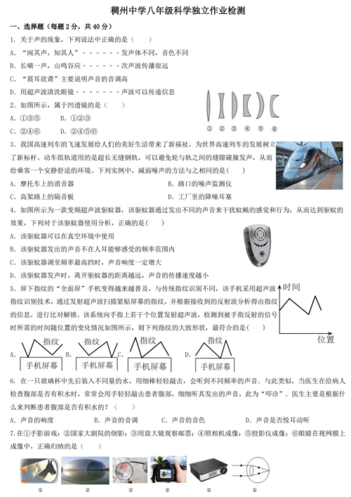 浙江省金华市义乌市稠州中学2025学年第一学期八年级科学独立作业检测(扫描版,无答案 第1章)